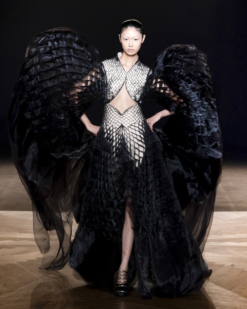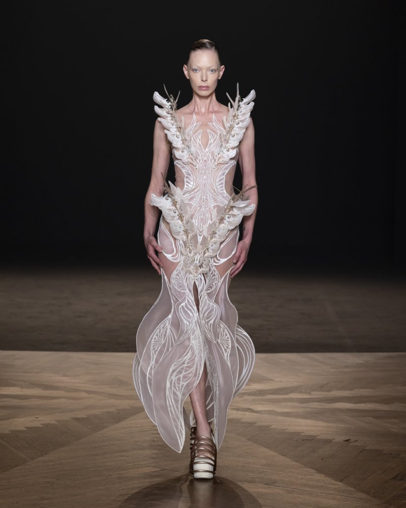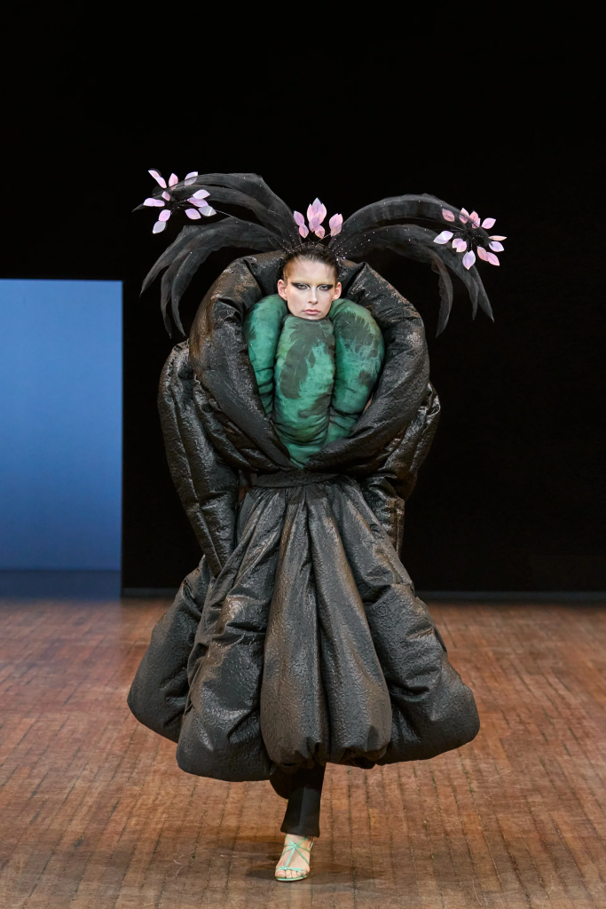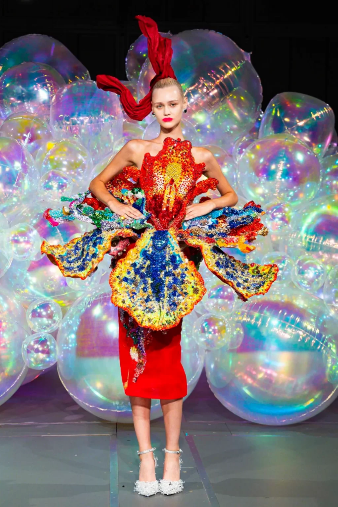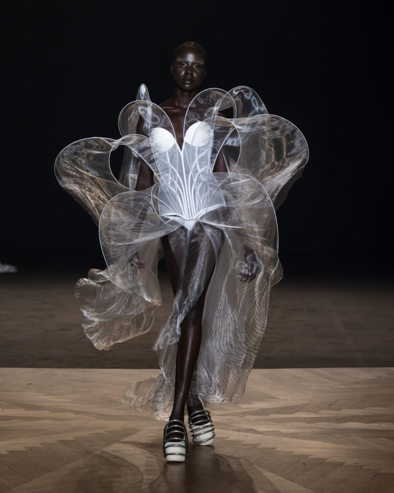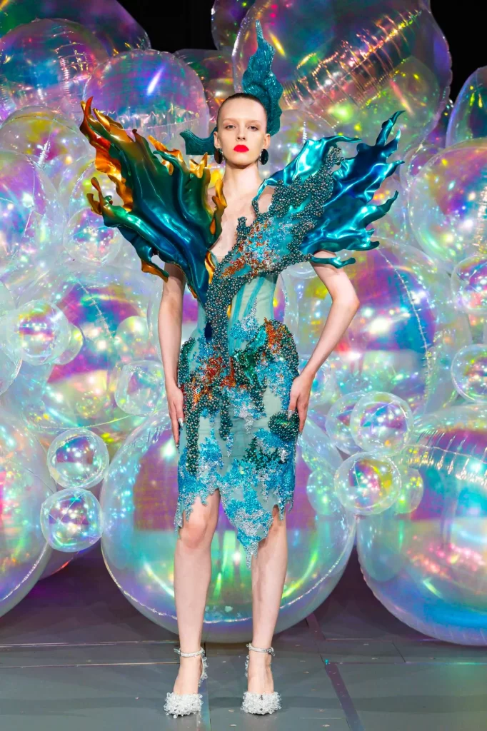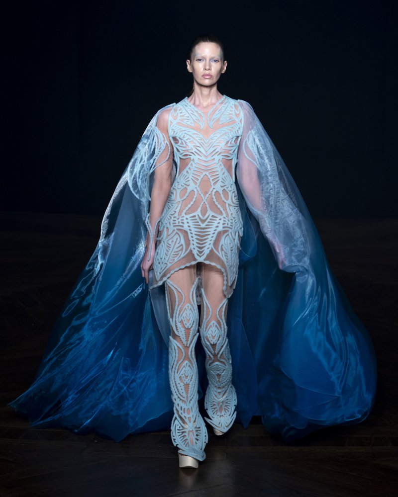 Dubbed “Sympoiesis,” Iris van Herpen’s collection centered on themes of ecosystems and interdependence. Humanity’s relationship with nature was expressed through dresses adorned with 25 million bioluminescent algae and alien-like sculptural designs.