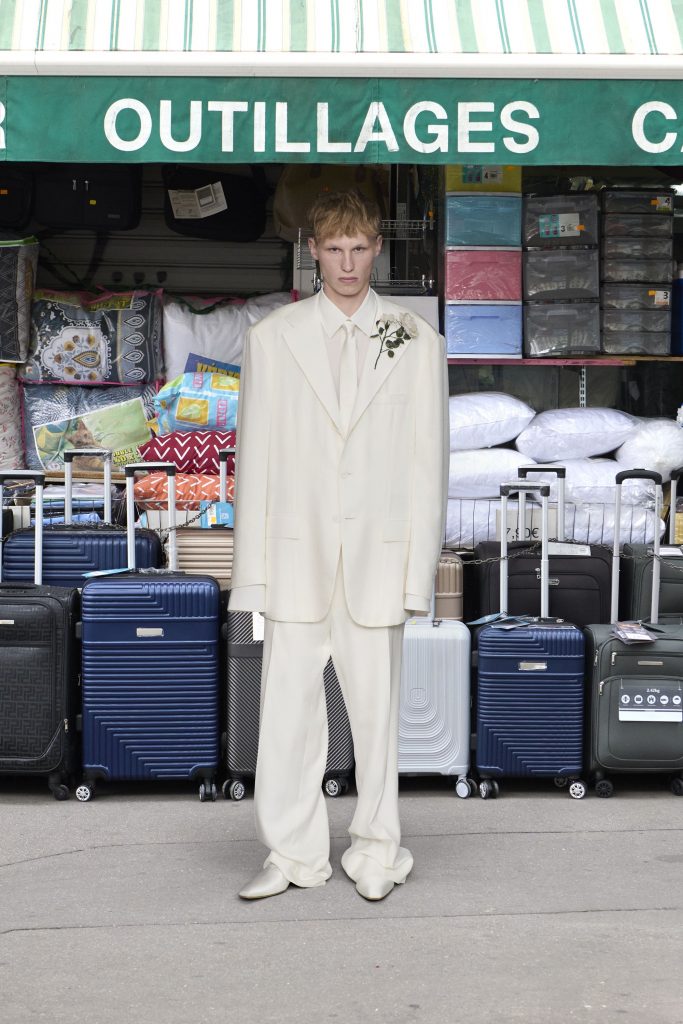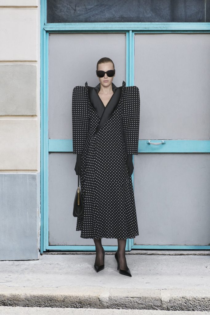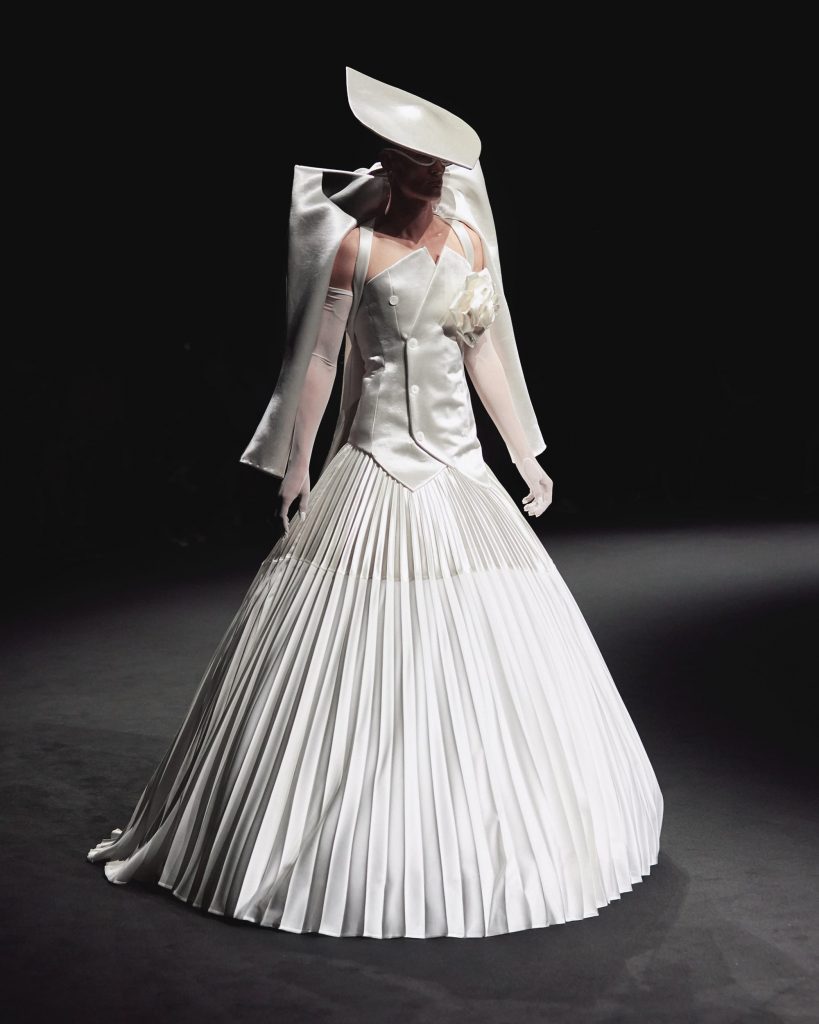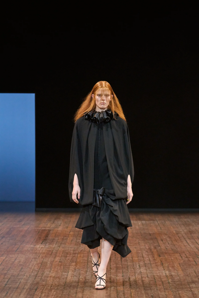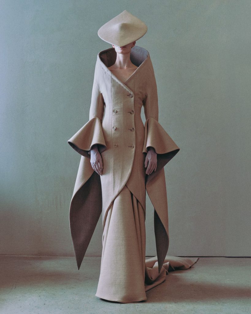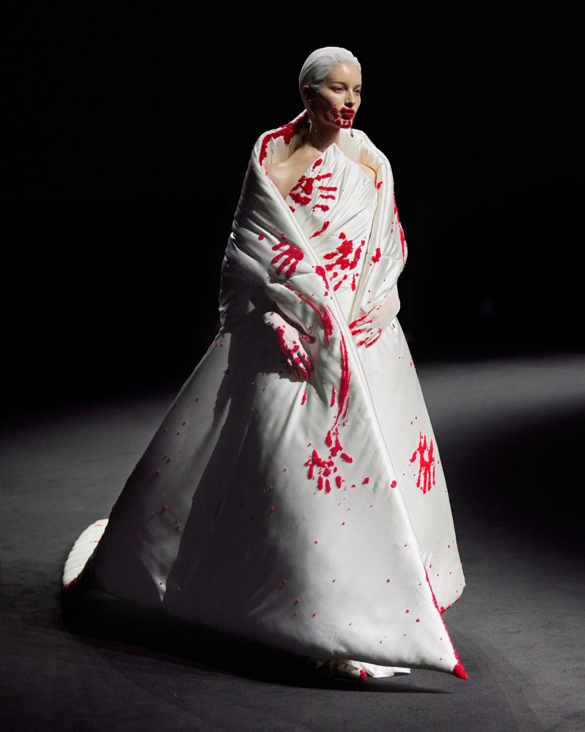 Demna Gvasalia’s final collection for Balenciaga was all about dramatic form. The collection featured bold silhouettes—think Nosferatu shoulders, cinched waists, and a cone-shaped, high-neck ivory guipure lace gown.