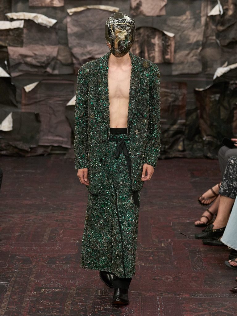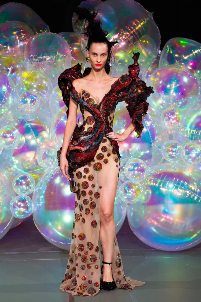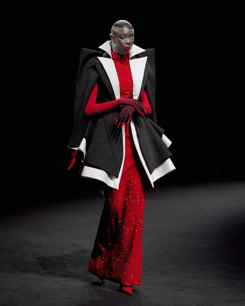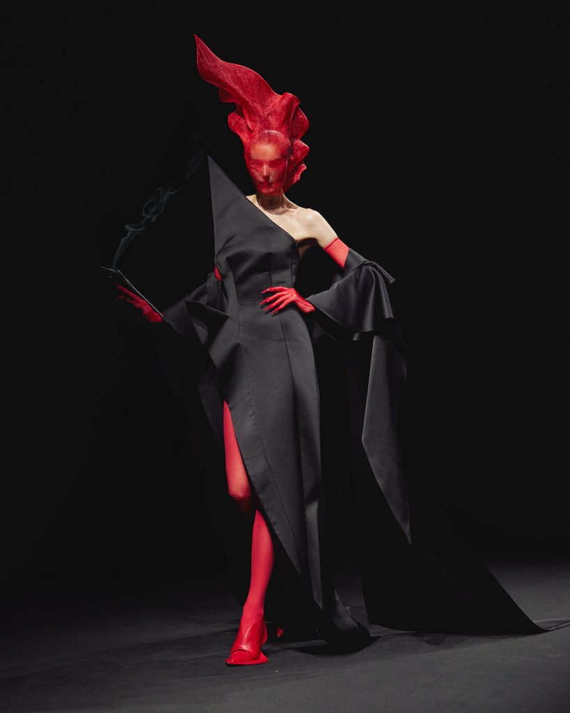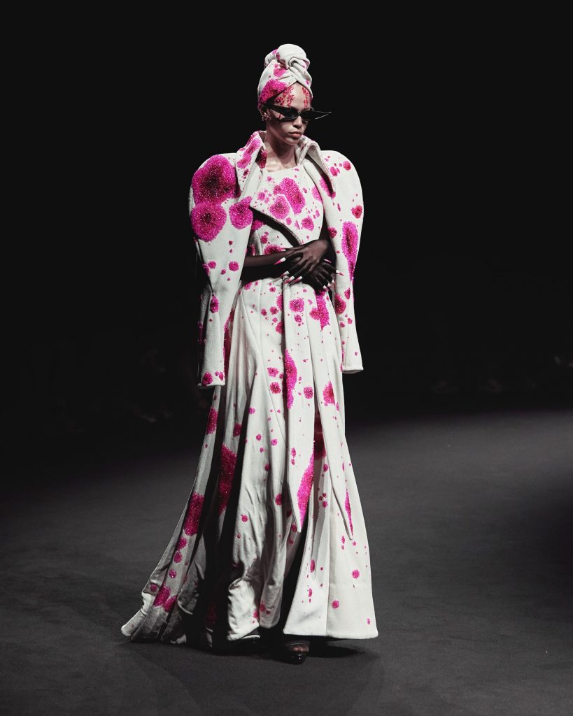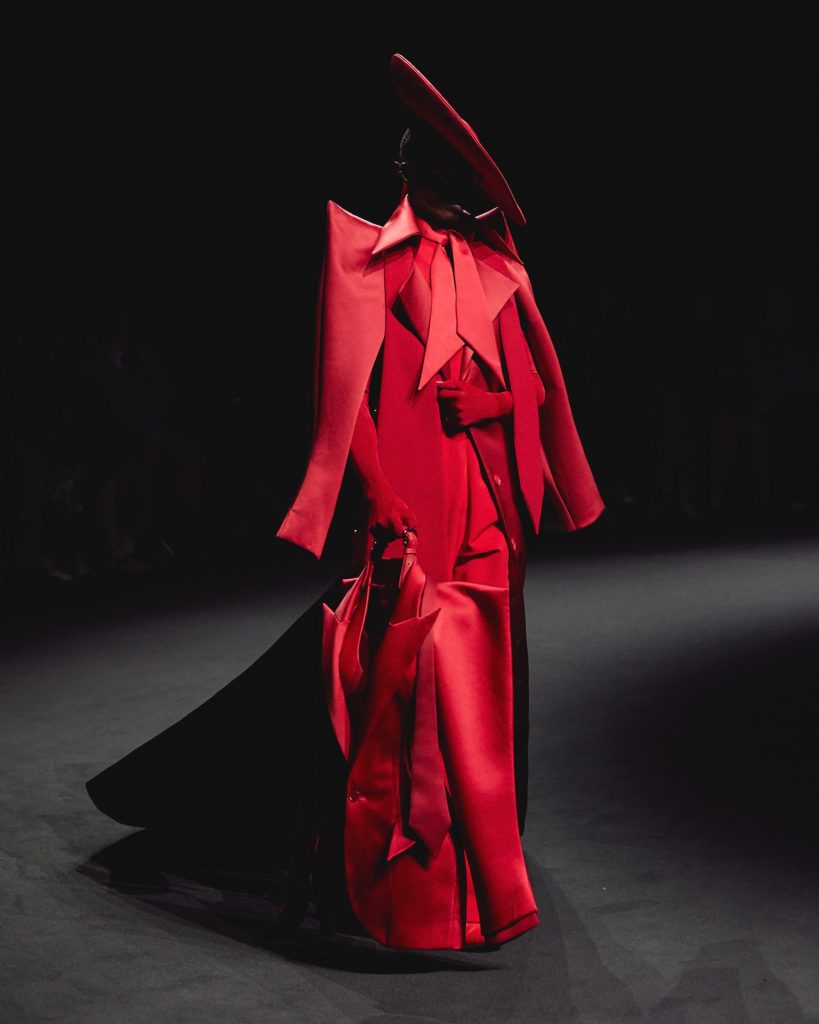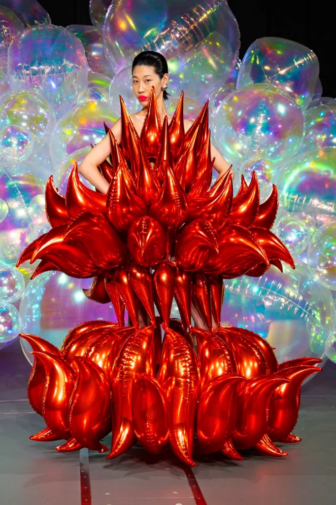Dubbed “Becoming,” Robert Wun’s couture line explores transformation and the rituals of dressing. The runway featured garments adorned with red crystal handprint embroidery, false limbs, and trompe-l’œil tailoring, paired with theatrical headpieces.
