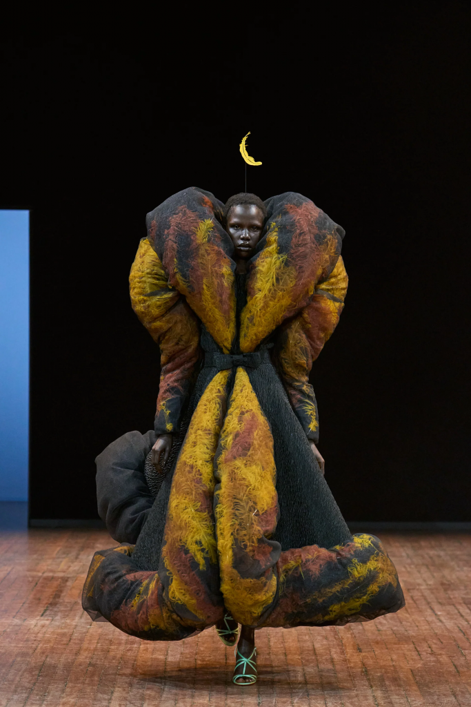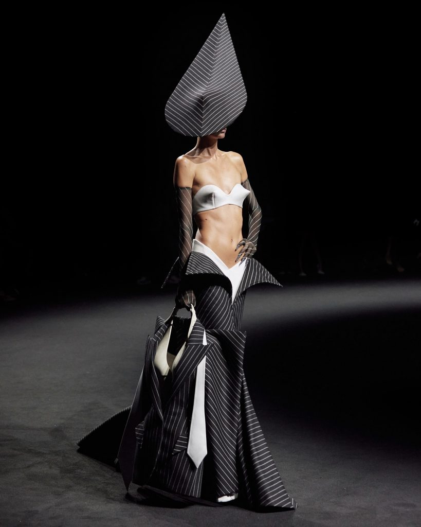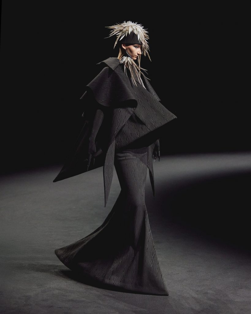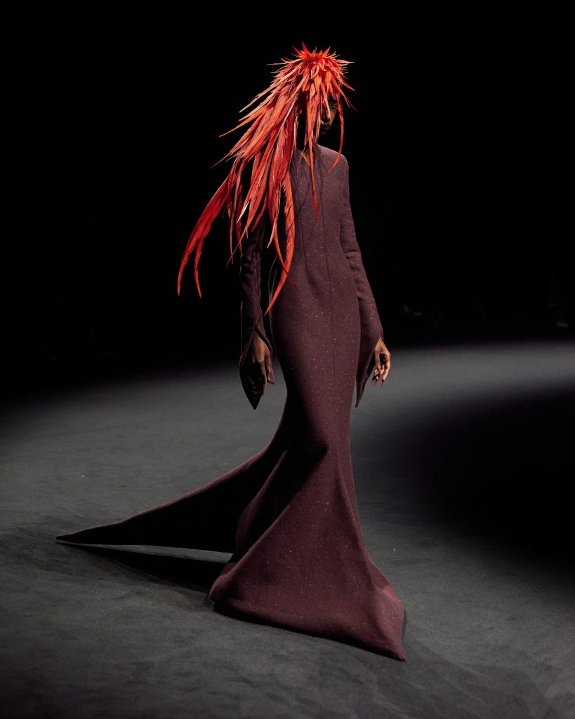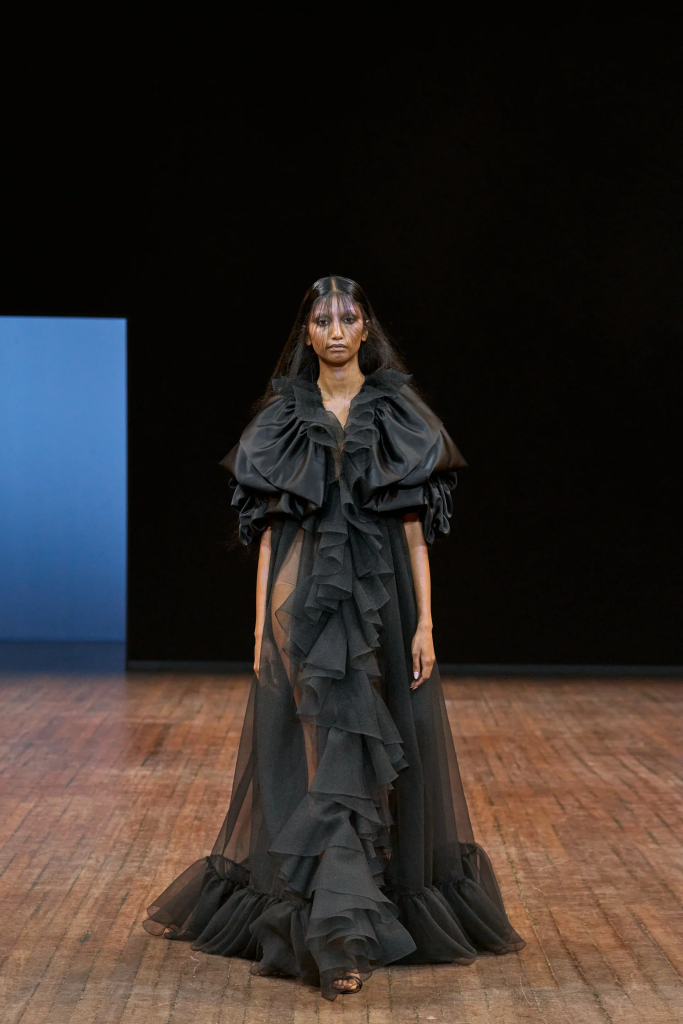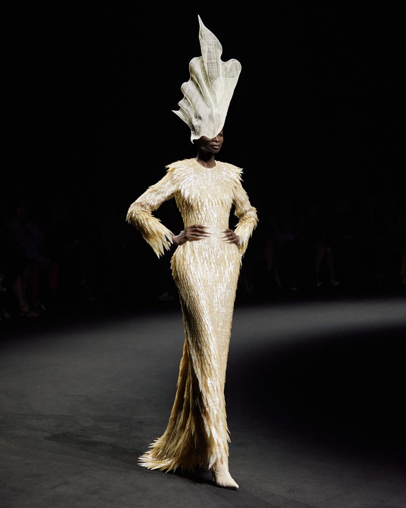 Dubbed “Becoming,” Robert Wun’s couture line explores transformation and the rituals of dressing. The runway featured garments adorned with red crystal handprint embroidery, false limbs, and trompe-l’œil tailoring, paired with theatrical headpieces.