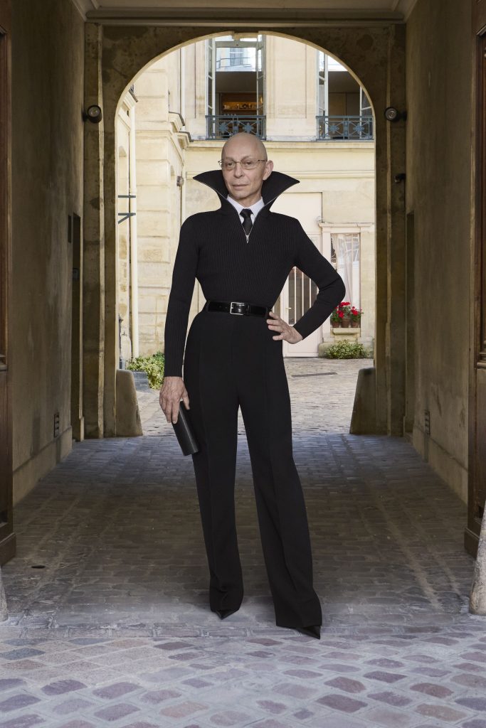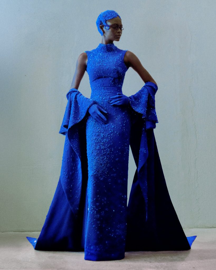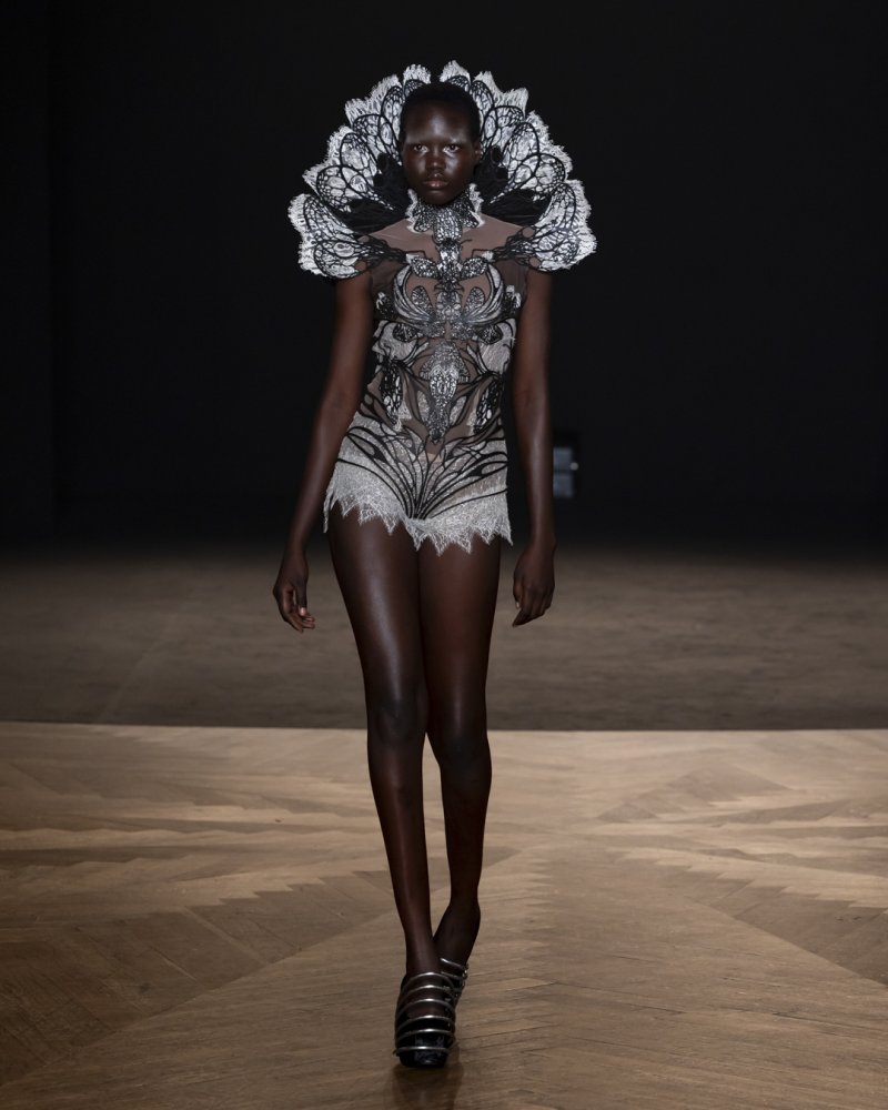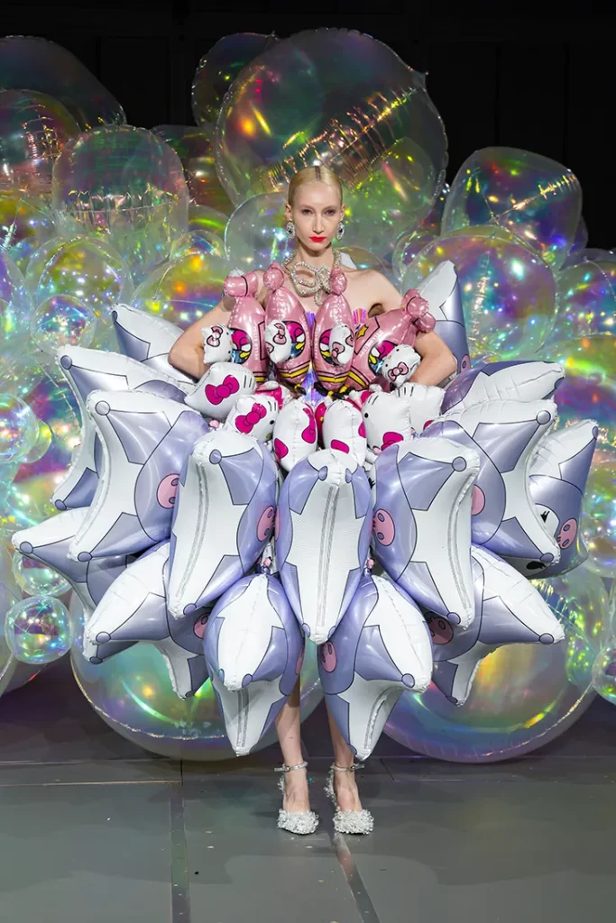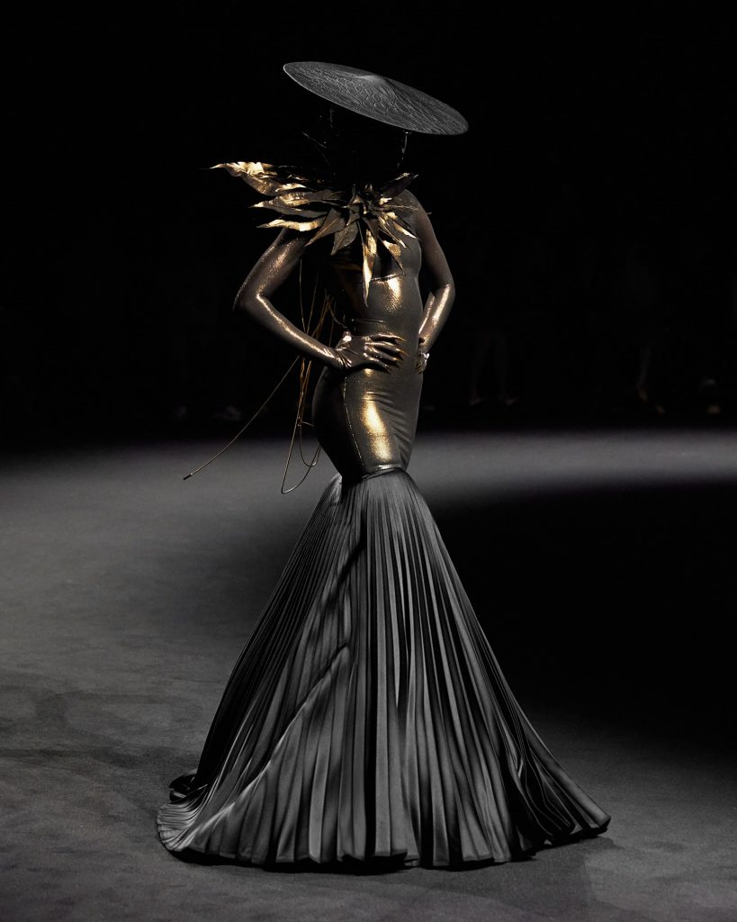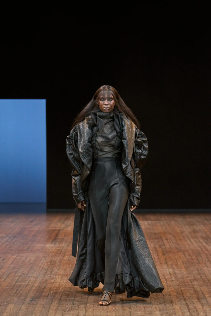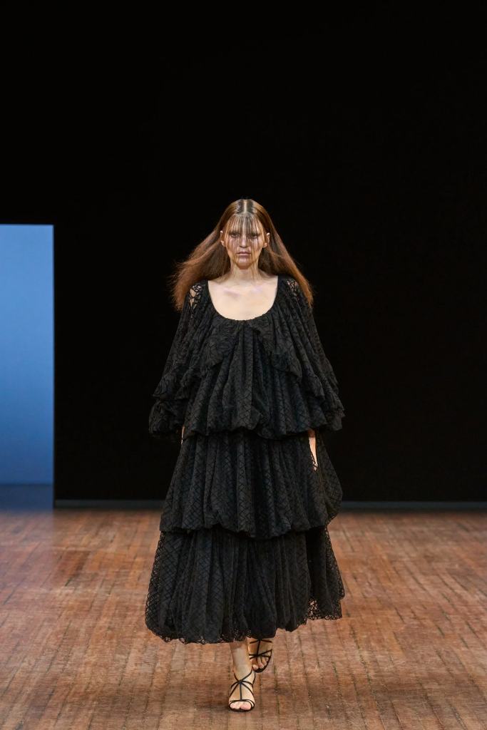 Dubbed “Becoming,” Robert Wun’s couture line explores transformation and the rituals of dressing. The runway featured garments adorned with red crystal handprint embroidery, false limbs, and trompe-l’œil tailoring, paired with theatrical headpieces.
