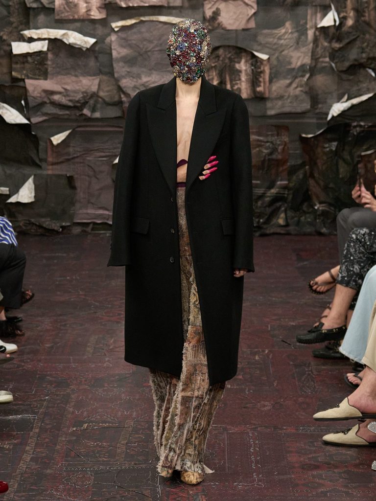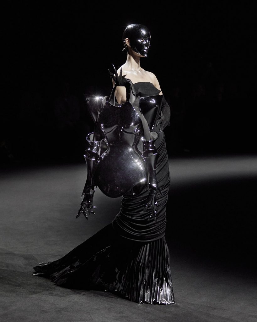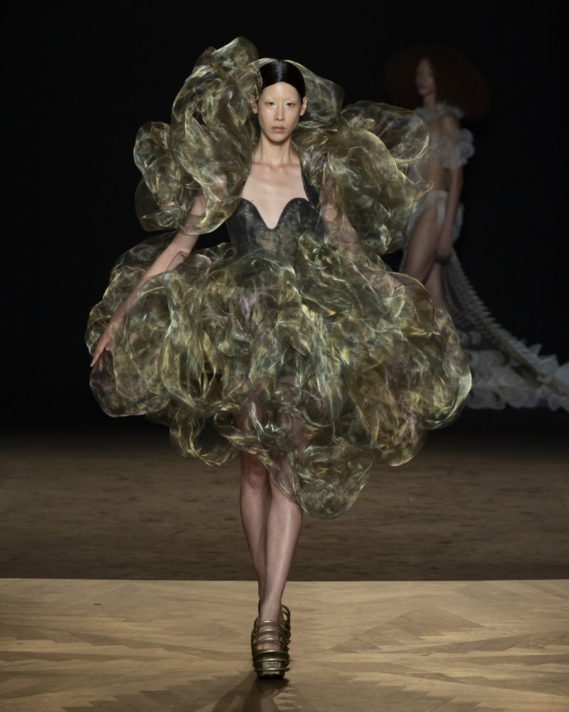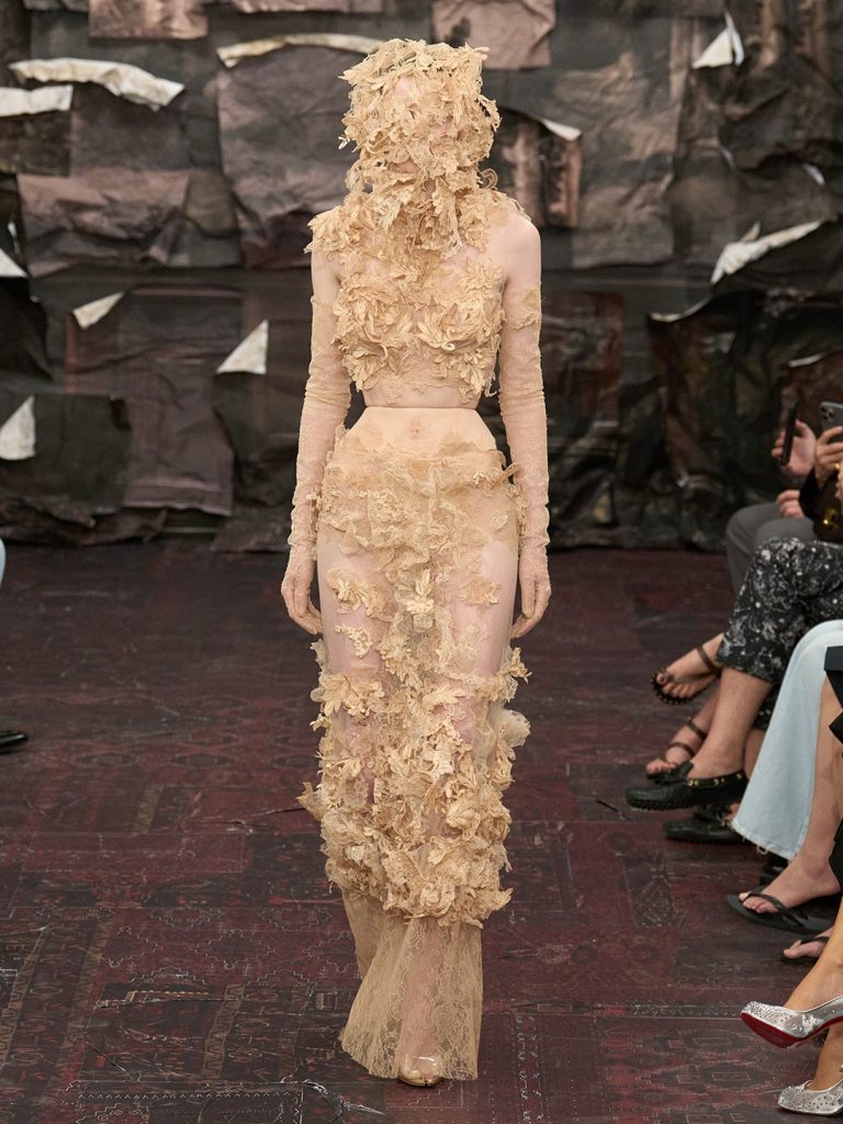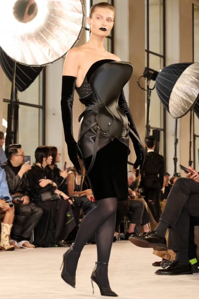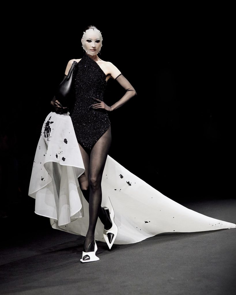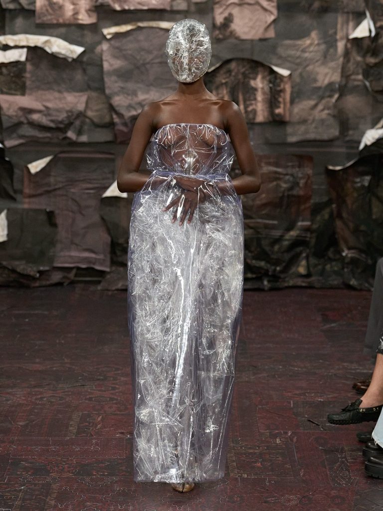 Glenn Martens marked his debut at the maison with a couture collection exploring “haunted beauty.” His masked muse wore pieces made of repurposed materials—plastic, manipulated organza, and leather—expressing his vision of decay and renewal.