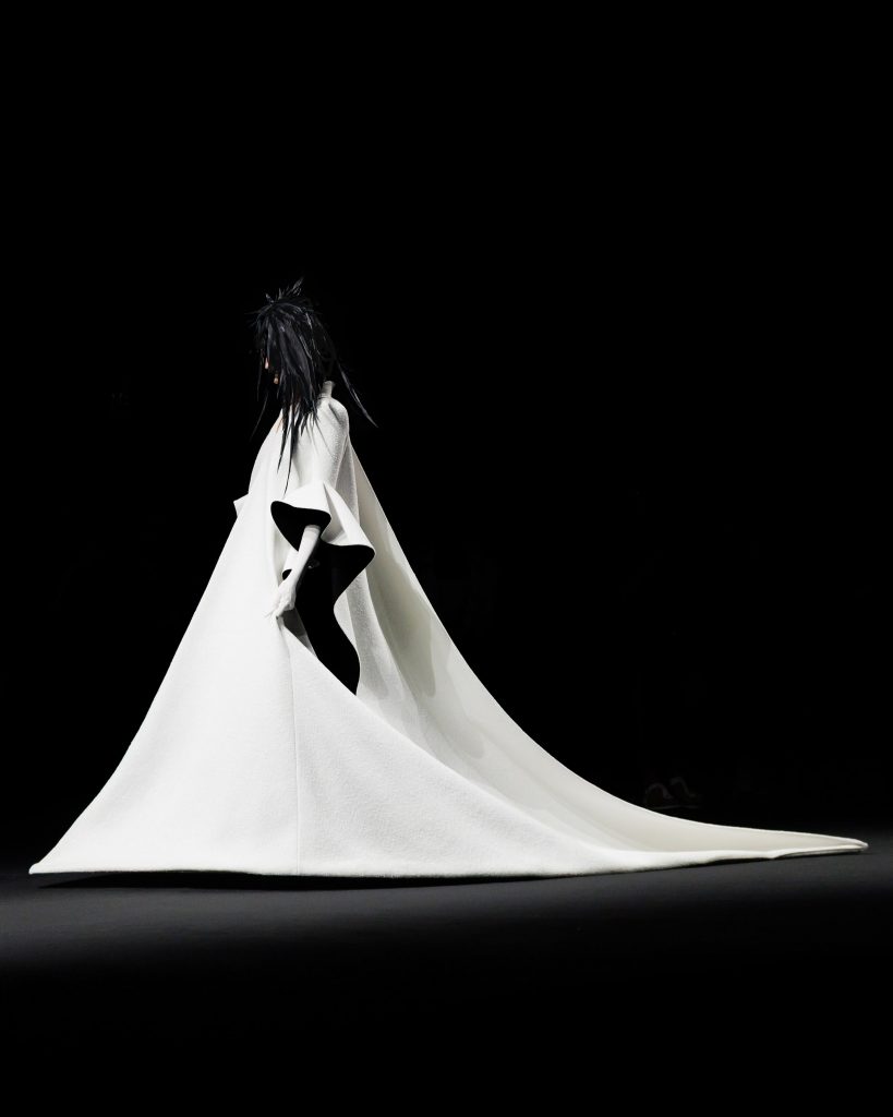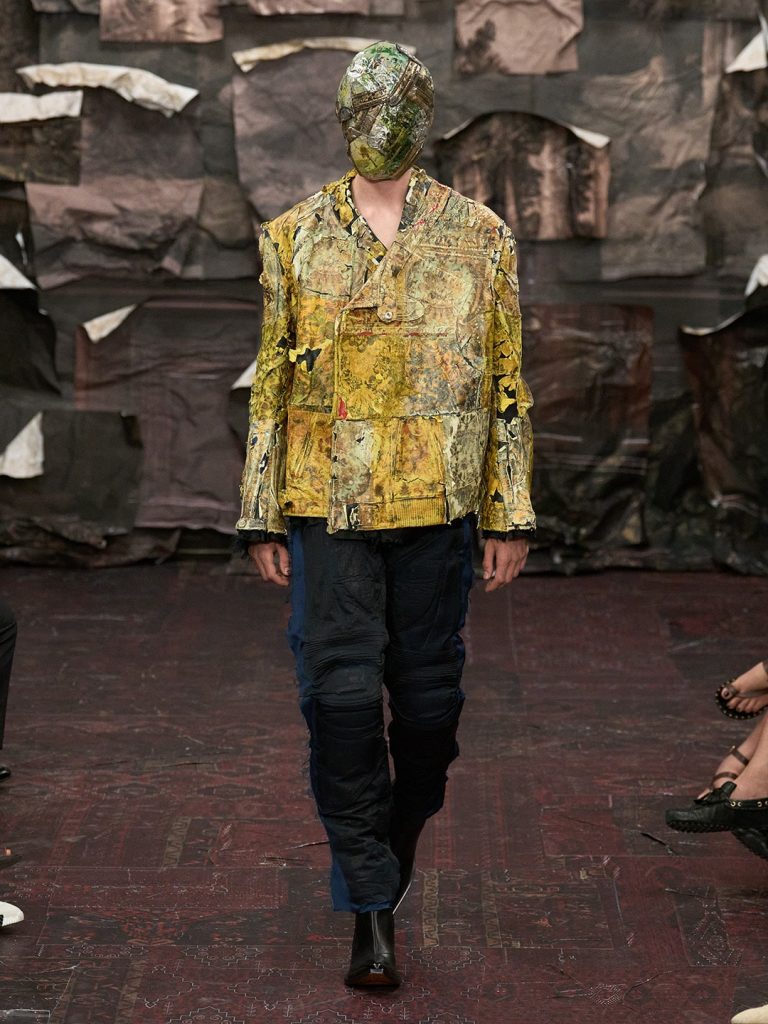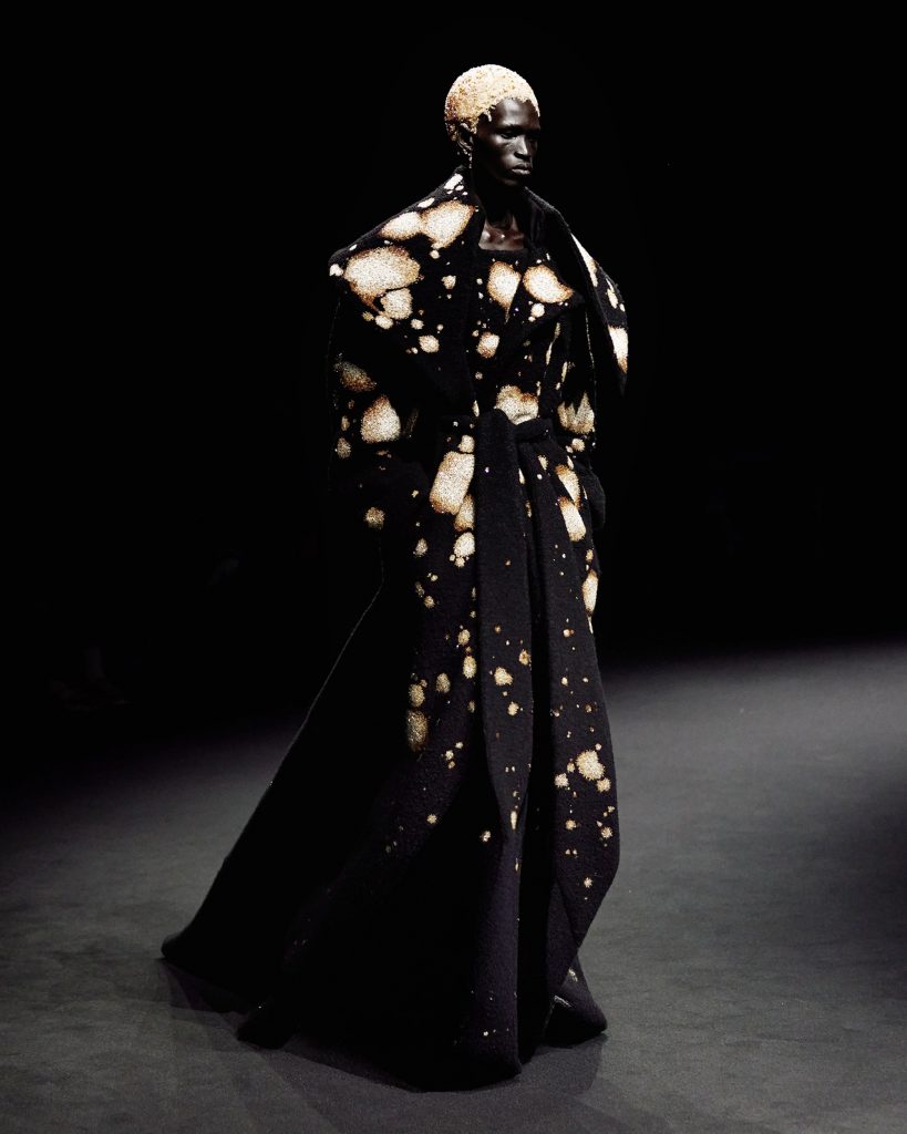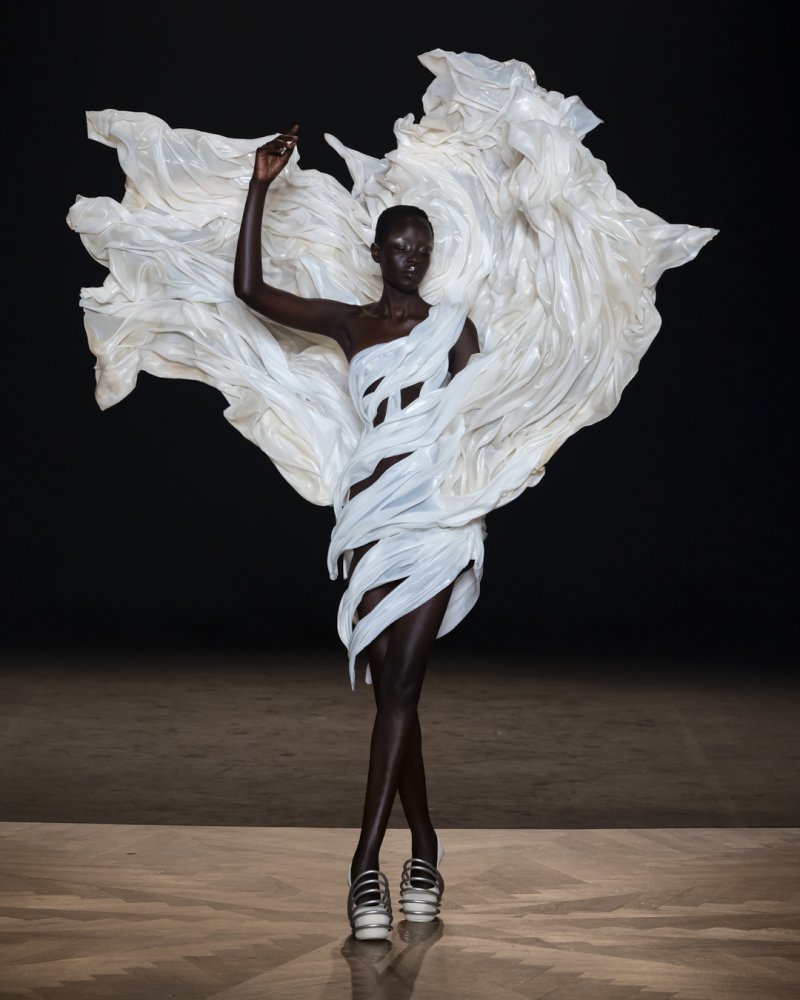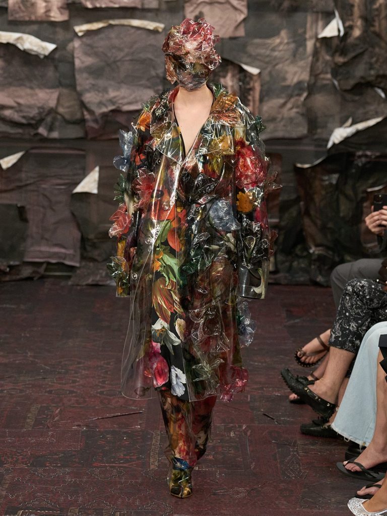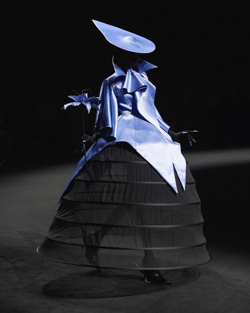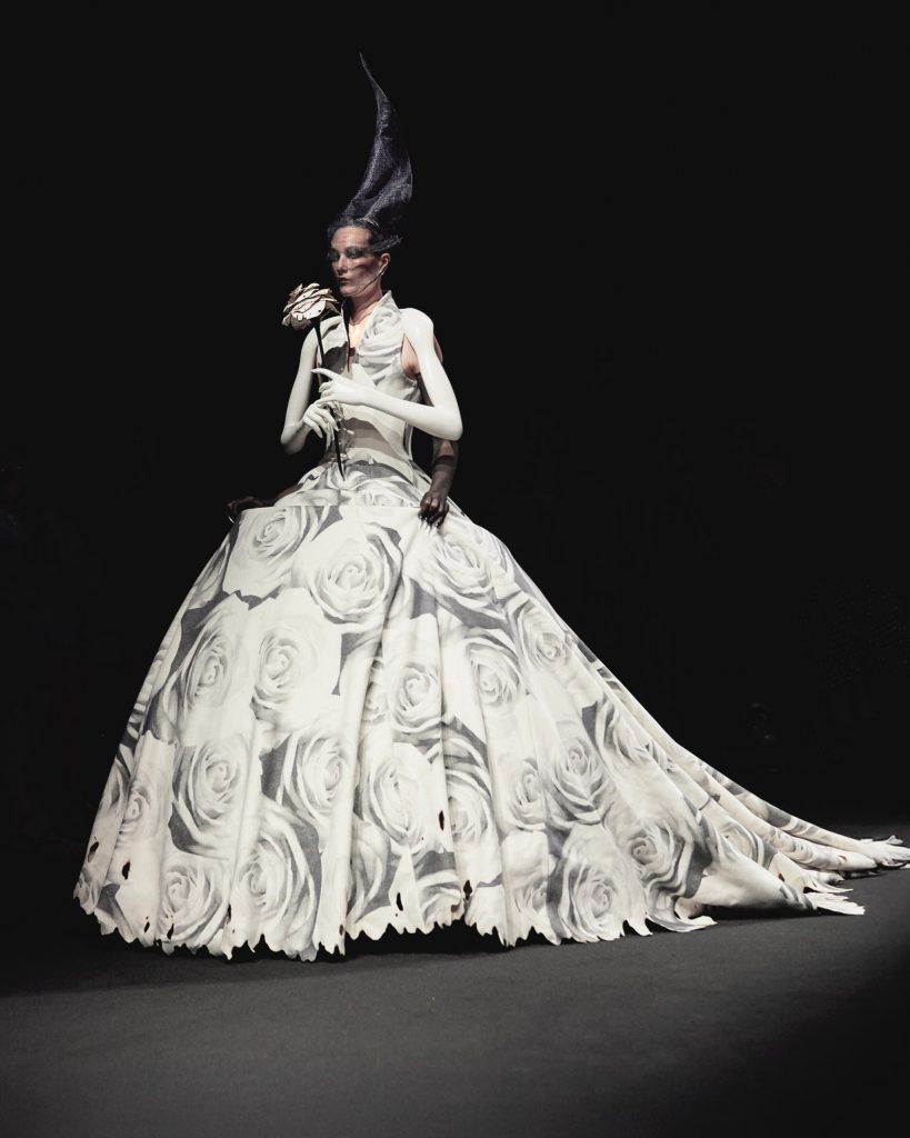 Glenn Martens marked his debut at the maison with a couture collection exploring “haunted beauty.” His masked muse wore pieces made of repurposed materials—plastic, manipulated organza, and leather—expressing his vision of decay and renewal.