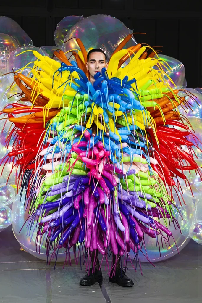 Joy and exuberance define Kevin Germanier’s “Les Joueuses” collection. Its childlike wonder came through balloon-like silhouettes, a myriad of patterns, and bright metallic hues—making it a truly campy showcase of sustainable creativity.