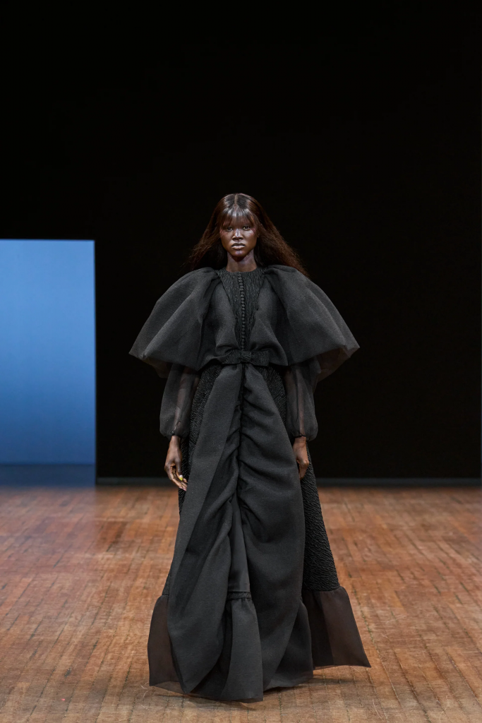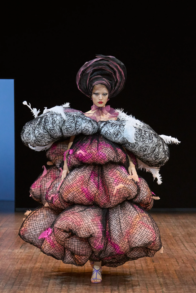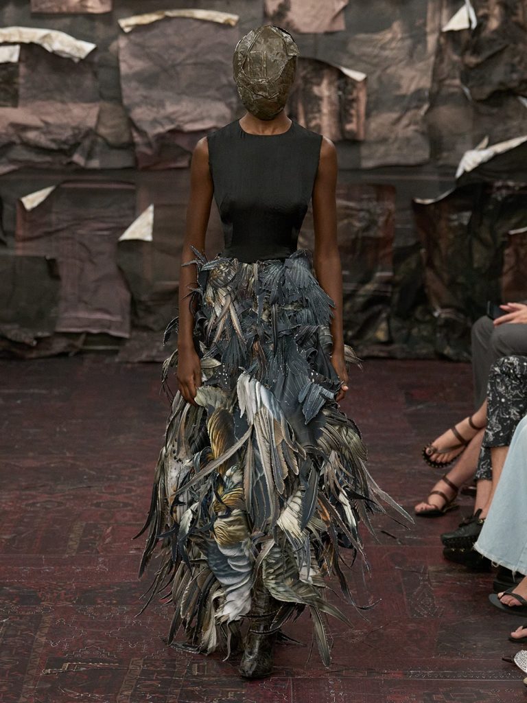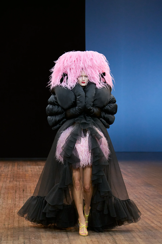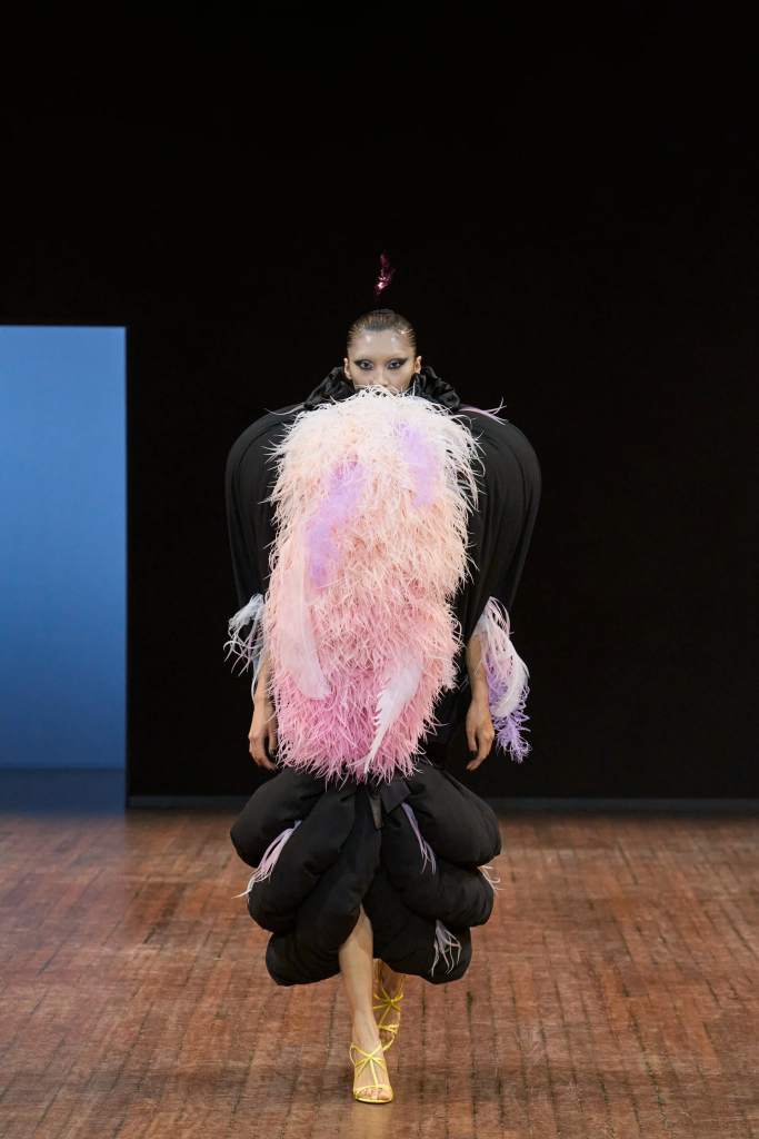 Viktor & Rolf’s “Angry Birds” collection explored the theme of duality. It featured 30 pieces—half stripped-down and minimal, the other half maximalist, adorned with faux feathers, voluminous shoulders, and dramatic collars.